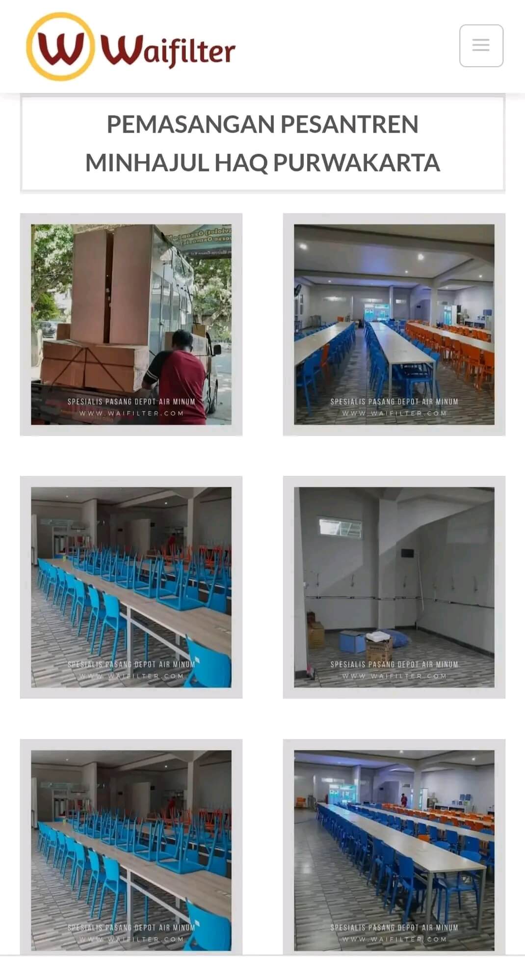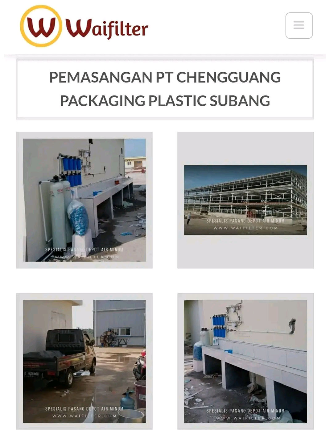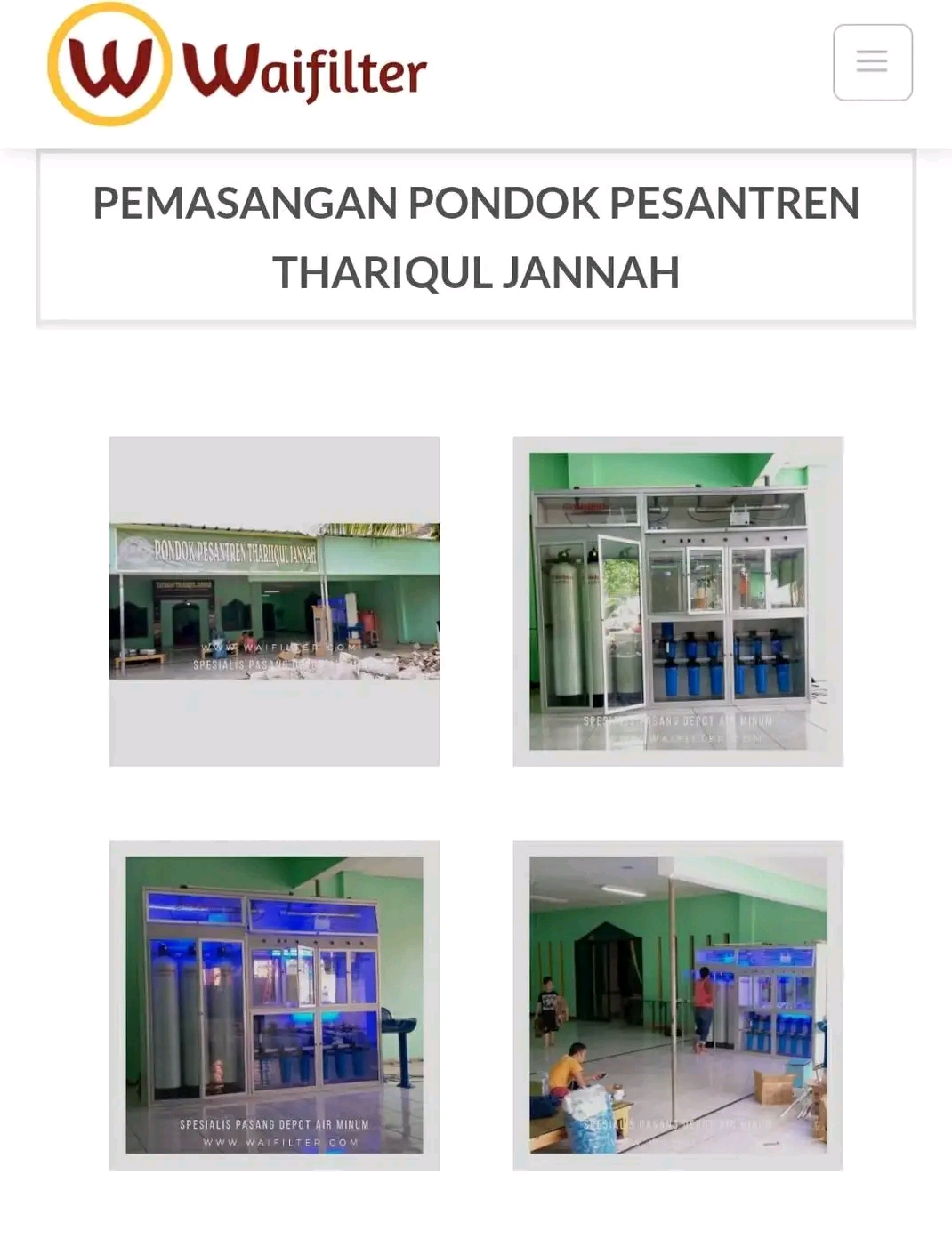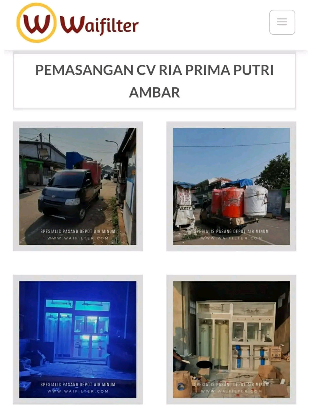 Waifilter adalah perusahaan yang bergerak menyediakan pemasangan alat depot air isi ulang mineral, mesin RO dan filter air (Water Treatment) yang telah berpengalaman di bidangnya.